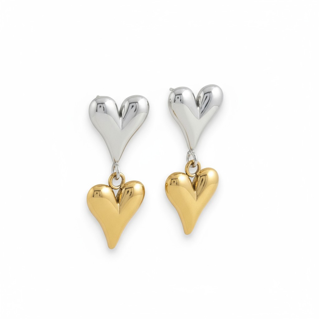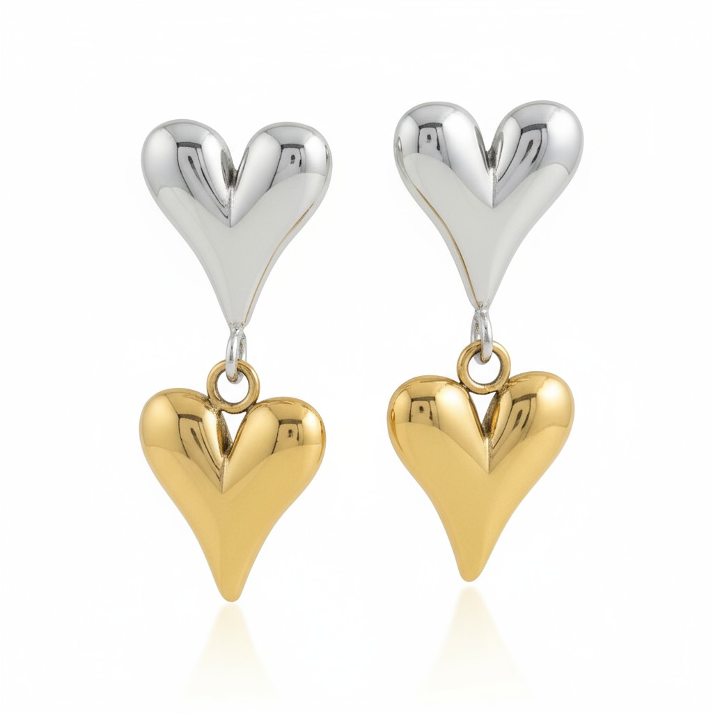 Ατσάλινα σκουλαρίκια με κρεμαστές καρδιές δίχρωμα. Ανθεκτικά στο νερό